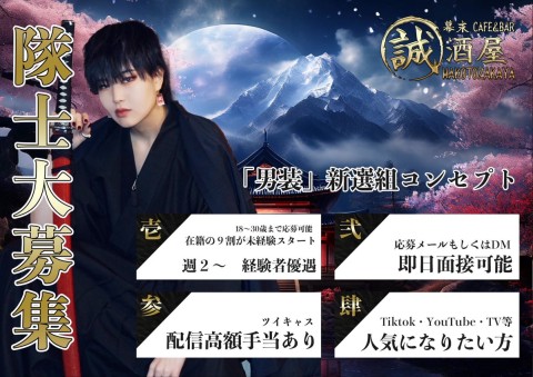 【男装募集】 誠酒屋の"新人隊士"を募集します🏯🌕 新撰組の和装を着て、いつもと違う自分にチャレンジしよう🇯🇵 【経験者優遇・🔰未経験者 大歓迎です!】 即日、面接OK👌ご応募、詳細はこちらから 👉 https://t.co/xbwZHPL2xP #秋葉原 #男装カフェ #誠酒屋 #男装バイト #コンカフェ求人 #TikTok https://t.co/SICTVTCUfI