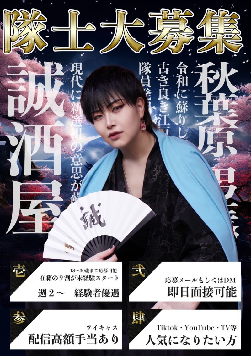 【男装募集】 誠酒屋の"新人隊士"を募集します🏯🌕 新撰組の和装を着て、いつもと違う自分にチャレンジしよう🇯🇵 【経験者優遇・🔰未経験者 大歓迎です!】 即日、面接OK👌ご応募、詳細はこちらから 👉 https://t.co/xbwZHPL2xP #秋葉原 #男装カフェ #誠酒屋 #男装バイト #コンカフェ求人 #TikTok https://t.co/h43bE5SZxA