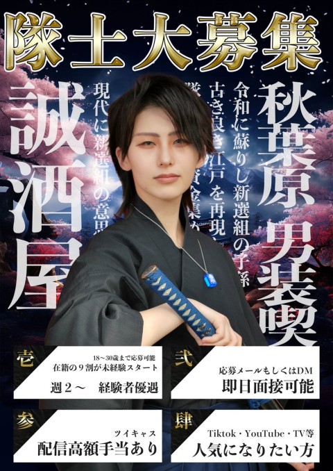 🔹男装募集🔹 誠酒屋の"新人隊士"を募集します🏯🌕 経験がある方、移籍も歓迎します🇯🇵 【在籍の9割が🔰未経験スタートのお店】 即日、面接OK👌ご応募、詳細はこちらから 👉 LINE公式求人https://t.co/JbtobOFuUb お気軽にご連絡ください📩 #秋葉原 #男装カフェ #誠酒屋 #男装バイト #コンカフェ https://t.co/WAM37RCurG