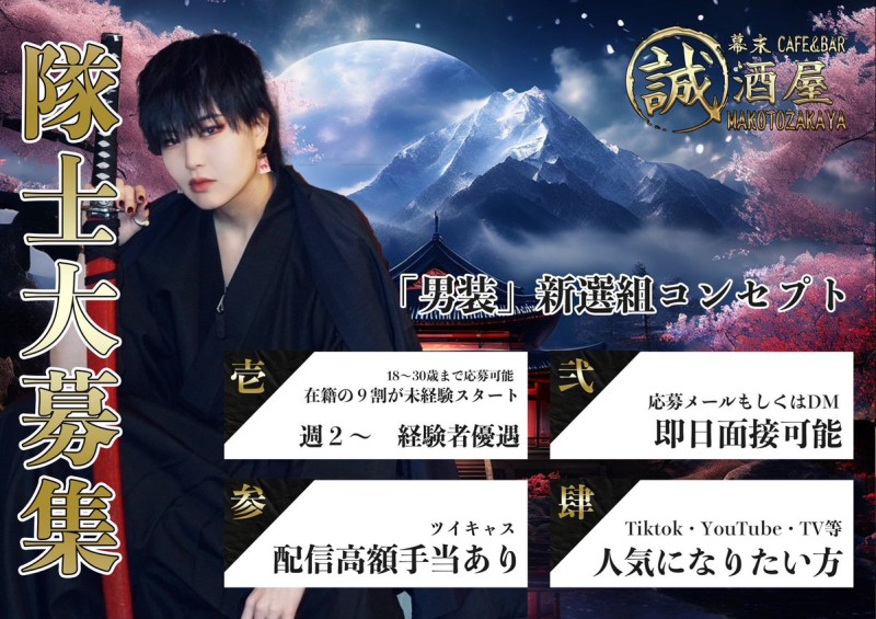 🔹男装募集🔹 誠酒屋の"新人隊士"を募集します🏯🌕 経験がある方、移籍も歓迎します🇯🇵 【在籍の9割が🔰未経験スタートのお店】 即日、面接OK👌ご応募、詳細はこちらから 👉 LINE公式求人https://t.co/JbtobOFuUb お気軽にご連絡ください📩 #秋葉原 #男装カフェ #誠酒屋 #男装バイト #コンカフェ https://t.co/WAM37RCurG