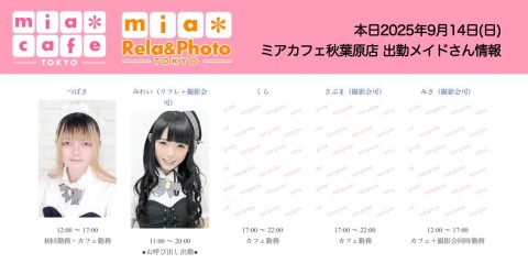 ★メイドカフェ・ミアカフェ #秋葉原 店★ ☕️営業予定日☕️ 🎀9月13日(土)  12-22 くら  12-17 さぶま  17-22 にろ 🎀9月14日(日)  12-17 みさ、新人さん【初お給仕】  17-22 さぶま、くら  リラ&フォトお呼び出し みれい 🎀9月15日(月祝)  12-17 さぶま  17-22 おとめ【卒業】、まな https://t.co/pLZUgClAe3