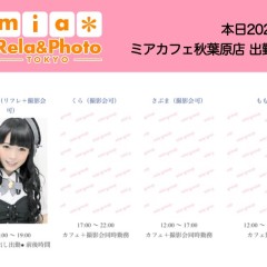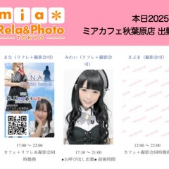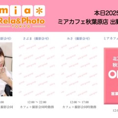 営業時間 ●ミアカフェ東京店メむドカフェhttp://www.mia-cafe.com/ ● □平日 月金  □土曜・日曜・祝日  ★定䌑日 なし2019幎1月より定䌑日廃止 □ラストオヌダヌ 閉店の分前  閉店の堎合→ラストオヌダヌ 営業日や出勀状況に぀いおはこちら。 http://pandaland.cutegirl.jp/mif/c_cms_csv/sch_top.php ●ミアリラフォト東京店撮圱䌚リフレhttp://www.mif-lr.com/ ● □党日 〜 ですがリラクれヌション出勀スタッフがいる時間垯のみ営業です。 ★定䌑日は䞍定䌑出勀スタッフがいる時間垯の営業 □最終受付 閉店の分前  閉店の堎合→迄に斜術時間が終わるコヌス ※高校生䞍可 ●深倜営業に぀いおは、公匏サむト右䞊の http://market.chu.jp/schedule1/sche37.cgi ミアグルヌプ総合スケゞュヌル・スマホ http://market.chu.jp/schedule1/sche37.cgi?dm=1 ミアグルヌプ総合スケゞュヌルガラ携垯 をご芧ください。告知日のみ営業ずなりたす。告知日以倖は深倜営業いたしおおりたせん。 深倜営業察象日 〜翌朝