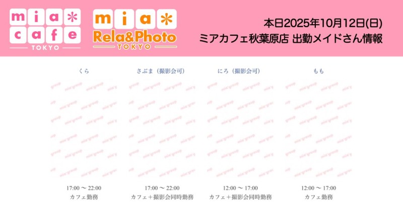 | å¶æ¥æé | âãã¢ã«ãã§æ±äº¬åºïŒã¡ã€ãã«ãã§ïŒhttp://www.mia-cafe.com/ãâ â¡å¹³æ¥ãæïœéãïŒïŒïŒïŒïŒïœïŒïŒïŒïŒïŒ â¡åæã»æ¥æã»ç¥æ¥ãïŒïŒïŒïŒïŒïœïŒïŒïŒïŒïŒ â å®äŒæ¥ããªãïŒ2019幎1æããå®äŒæ¥å»æ¢ïŒ â¡ã©ã¹ããªãŒããŒãéåºã®ïŒïŒåå ãïŒïŒïŒïŒïŒéåºã®å ŽåâïŒïŒïŒïŒïŒã©ã¹ããªãŒããŒ å¶æ¥æ¥ãåºå€ç¶æ³ã«ã€ããŠã¯ãã¡ãã http://pandaland.cutegirl.jp/mif/c_cms_csv/sch_top.php âãã¢ãªã©ïŒãã©ãæ±äº¬åºïŒæ®åœ±äŒïŒãªãã¬ïŒhttp://www.mif-lr.com/ãâ â¡å šæ¥ãïŒïŒïŒïŒïŒãïŒïŒïŒïŒïŒãã§ãããªã©ã¯ãŒãŒã·ã§ã³åºå€ã¹ã¿ãããããæé垯ã®ã¿å¶æ¥ã§ãã â å®äŒæ¥ã¯äžå®äŒïŒåºå€ã¹ã¿ãããããæé垯ã®å¶æ¥ïŒ â¡æçµåä»ãéåºã®ïŒïŒåå ãïŒïŒïŒïŒïŒéåºã®å ŽåâïŒïŒïŒïŒïŒïŒïŒïŒïŒïŒïŒè¿ã«æœè¡æéãçµããã³ãŒã¹ïŒ â»é«æ ¡çäžå¯ âæ·±å€å¶æ¥ã«ã€ããŠã¯ãå ¬åŒãµã€ãå³äžã® http://market.chu.jp/schedule1/sche37.cgi ãã¢ã°ã«ãŒãç·åã¹ã±ãžã¥ãŒã«ïŒïŒ°ïŒ£ã»ã¹ããïŒ http://market.chu.jp/schedule1/sche37.cgi?dm=1 ãã¢ã°ã«ãŒãç·åã¹ã±ãžã¥ãŒã«ïŒã¬ã©æºåž¯ïŒ ãã芧ãã ãããåç¥æ¥ã®ã¿å¶æ¥ãšãªããŸããåç¥æ¥ä»¥å€ã¯æ·±å€å¶æ¥ããããŠãããŸããã æ·±å€å¶æ¥å¯Ÿè±¡æ¥ãïŒïŒïŒïŒïŒãç¿æïŒïŒïŒïŒïŒïŒ¬ïŒïŒ¯ïŒïŒïŒïŒïŒïŒ | ||||||||||||||